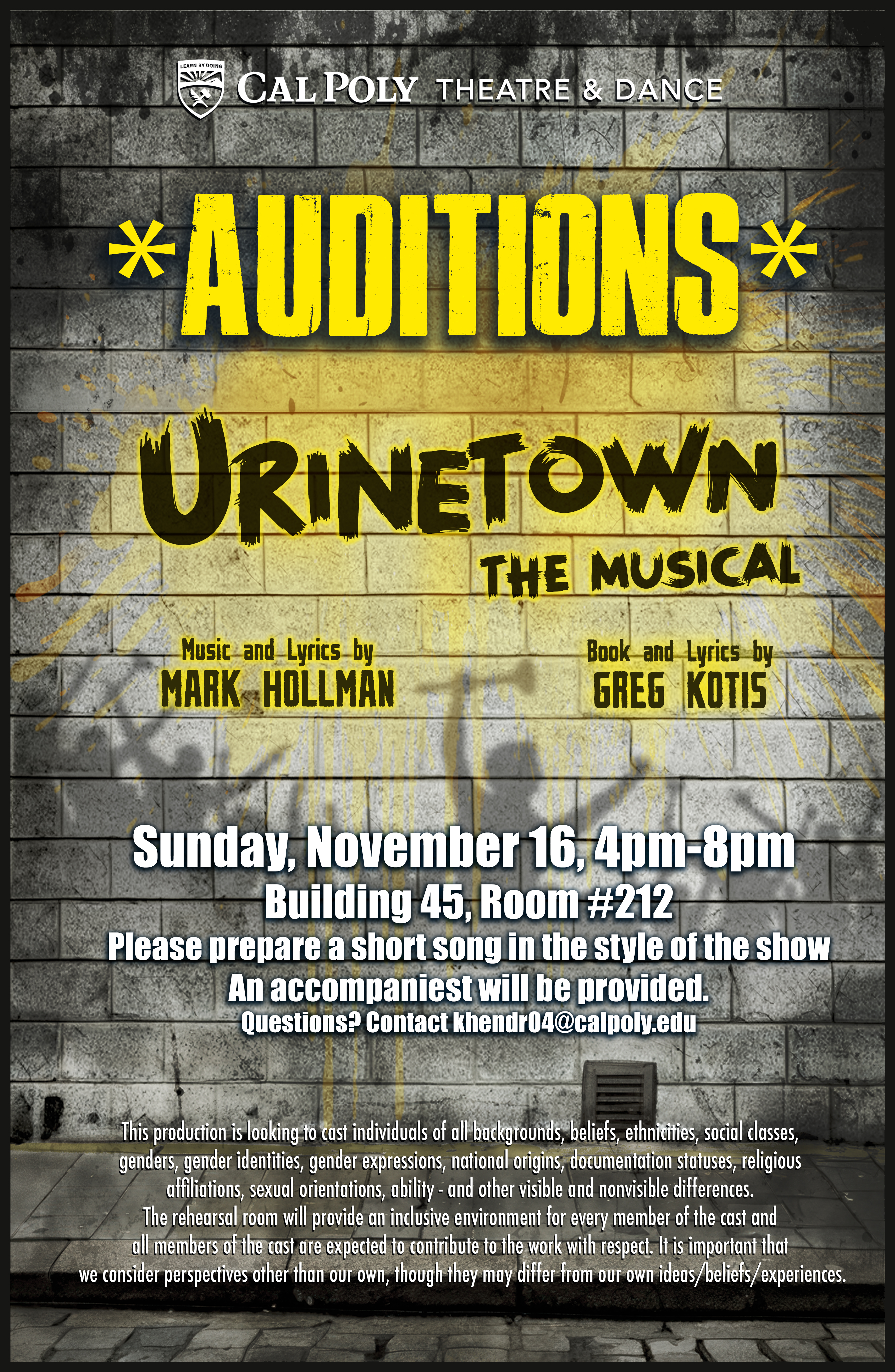 - Auditions: 4:00pm- 8:00pm, Sunday, November 16th, Black Box Theatre (Room 212, Building 45)
